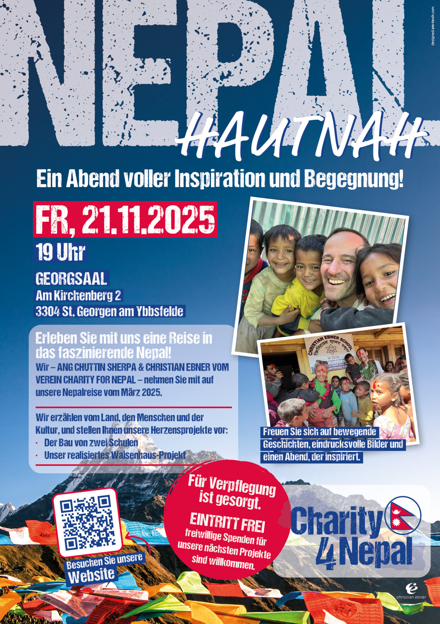 Am 21. November 2025 um 19:00 Uhr im Georgsaal, Am Kirchenberg 2, 3304 St. Georgen am Ybbsfelde berichten wir – Ang Chuttin Sherpa und Christian Ebner – von unserer Nepalreise im März 2025.
